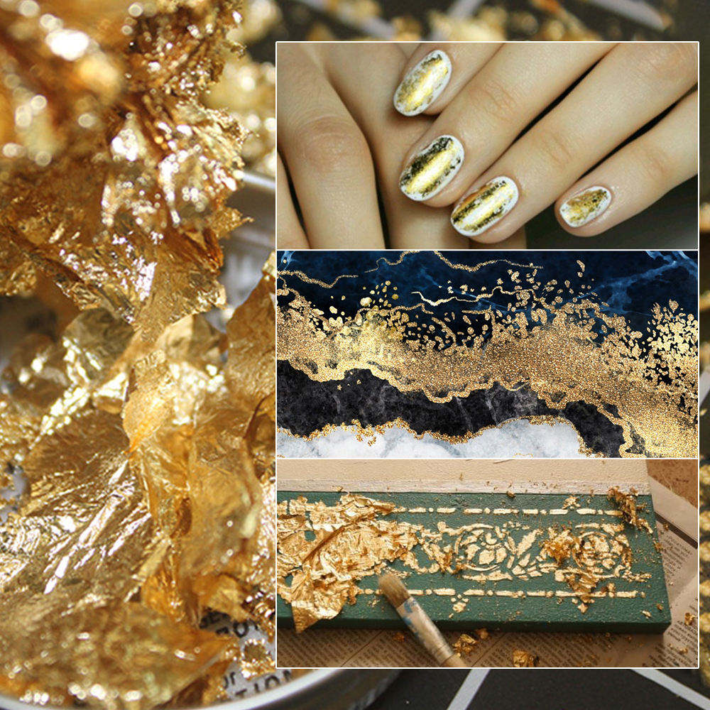 Shiny Broken Gold, Silver, and Copper Foil available in 2g–15g packs. Perfect for painting, cake decoration, nail art, crafts, and other creative projects. Lightweight and easy to apply for stunning decorative effects.