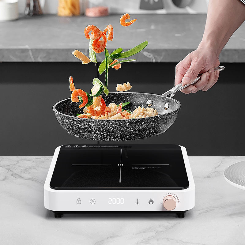 Feature Highlights – Single-burner 2000W induction cooker with touch control, black crystal glass surface, and copper coil for efficient heating. Compact (285×270×64mm), low-noise (<36dB), multifunctional for stir-frying, boiling, stewing, and temperature adjustment, ideal for home, hotel, or restaurant use.