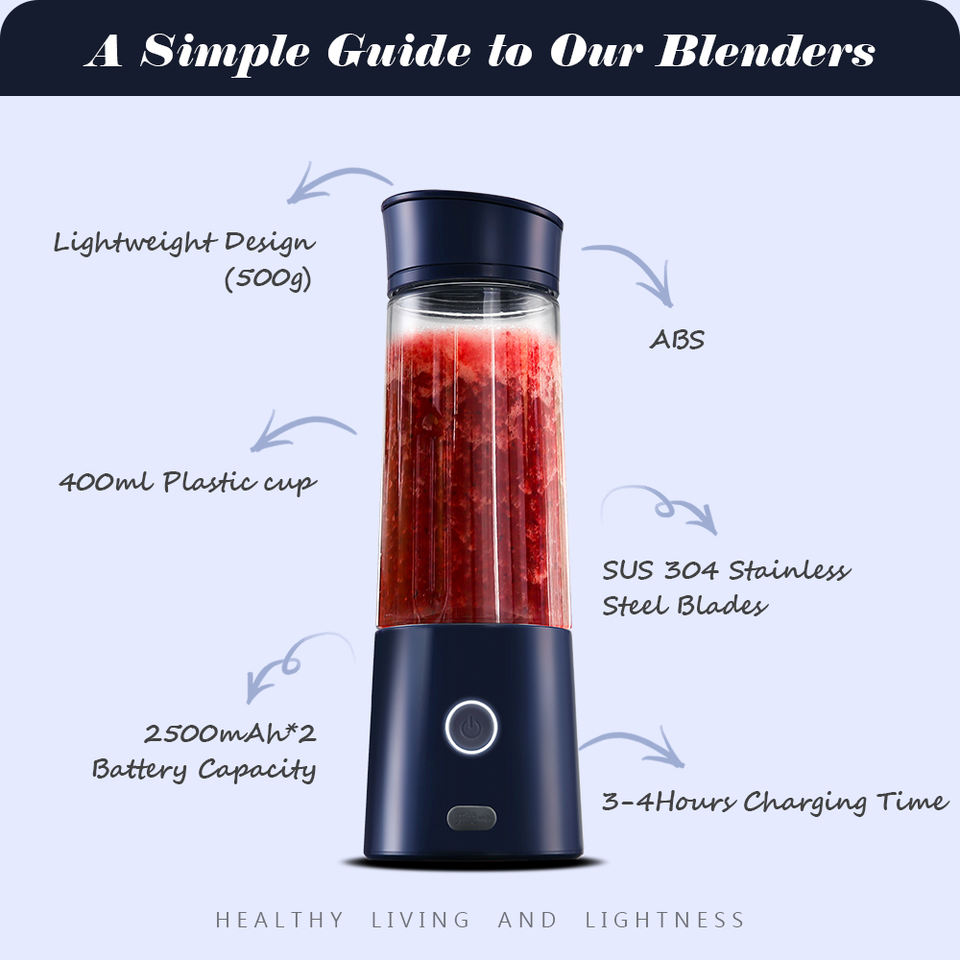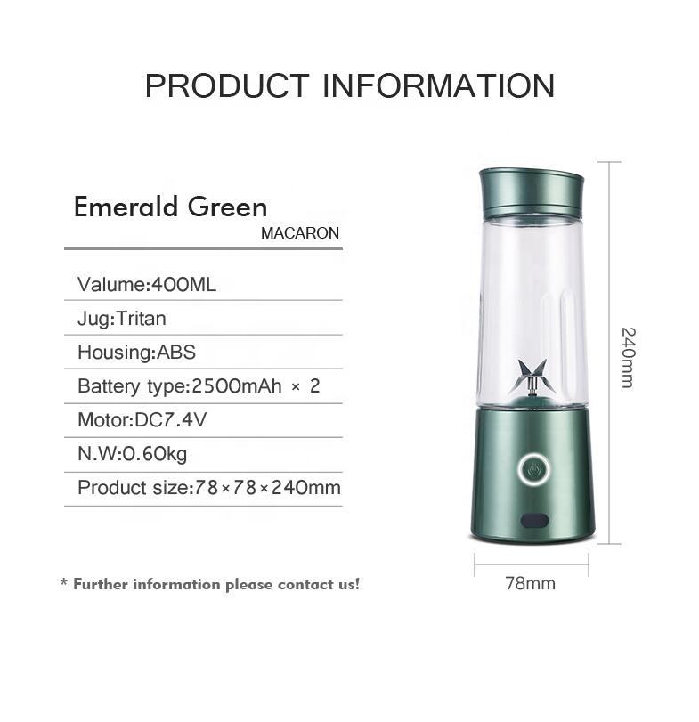 Portable Travel Juice Blender – Compact and cordless blender with a BPA-free jug, 6 stainless steel blades, and a 7.4V battery for 15–20 cups per charge. Features 45-second auto shut-off, USB fast charging in 3 hours, and CB-certified for international safety. OEM/ODM customization and high supplier reliability (97.9% satisfaction).